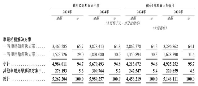 结合招股书可知,舜宇智行的业务结构较为单一,主要依赖车载相机解决方案,报告期内来自该业务板块的收入分别为49.84亿元、56.79亿元和49.25亿元,收入占比分别高达94.7%、94.8%和95.7%。