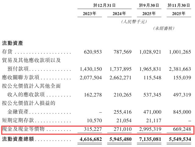 大额分红直接影响了舜宇智行的现金流状况,截至2025年9月末该公司的现金及现金等价物余额为29.95亿元,到11月末则迅速降至6.69亿元。短时间内资金的大幅减少,进一步加深了市场对其“先清仓分红,再上市补血”的质疑。