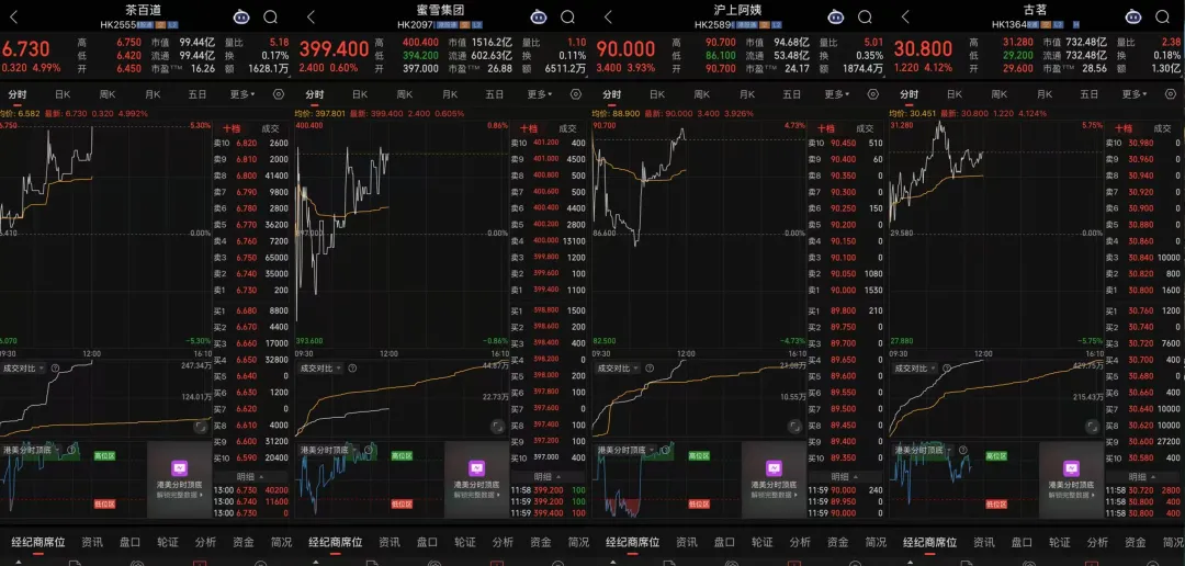 古茗一度涨超5%创上市来新高,沪上阿姨(02589.HK)、茶百道(02555.HK)、奈雪的茶(02150.HK)、蜜雪冰城(02097.HK)跟随上涨。