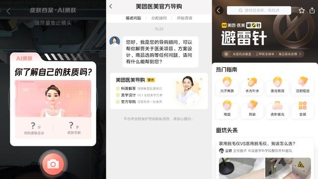此外,美团的美容医美板块还上线了AI测肤、美容顾问、避雷针等多个板块,并于今年8月发布“2023北极星医美机构榜”,推出基于用户口碑评价与医疗专业实力的医美机构榜单,在完善用户体验方面持续发力。