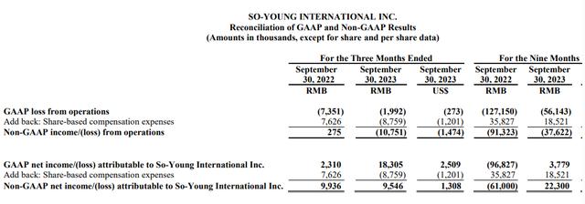 2023年第三季度,新氧的归母净利润为1830.5万元,较2022年同期的231.0万元猛增692.4%。非美国通用会计准则下,新氧的经调整净利润为954.6万元,较2022年同期的993.6万元下降3.93%。