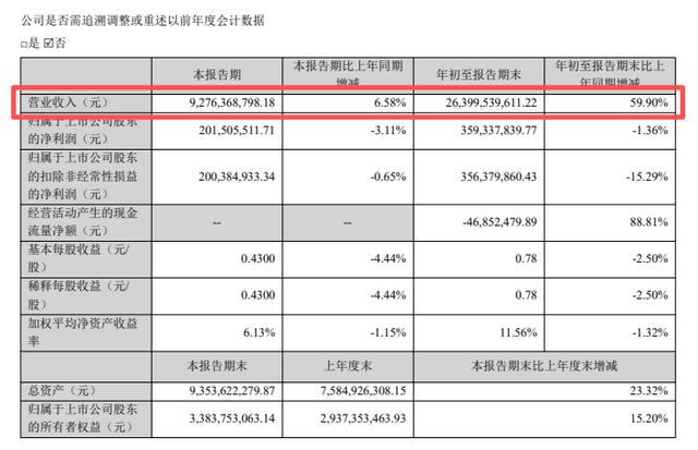 截至三季度末,公司总资产达93.54亿元,较上年末增长23.32%,归属于上市公司股东的所有者权益33.84亿元,较上年末增长15.20%,资产负债率从去年同期的68.77%降至63.27%,财务结构持续趋于稳健。