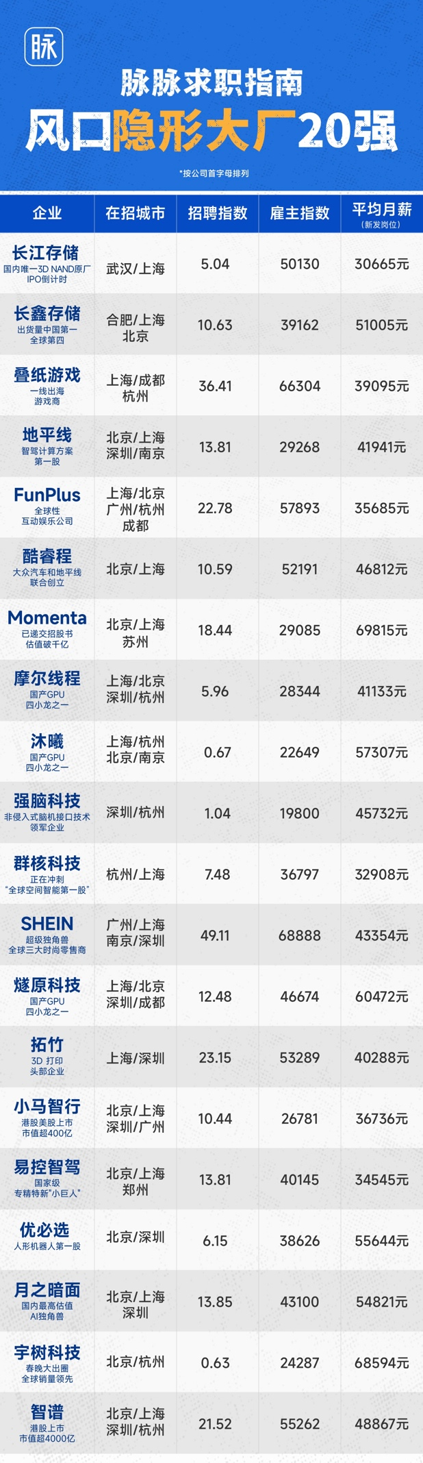 公司情报专家《财经涂鸦》获悉近日,脉脉发布80家“隐形大厂”名单,涵盖智谱、SHEIN、地平线、Momenta等企业,覆盖AI、智能驾驶、机器人、芯片等热门赛道。