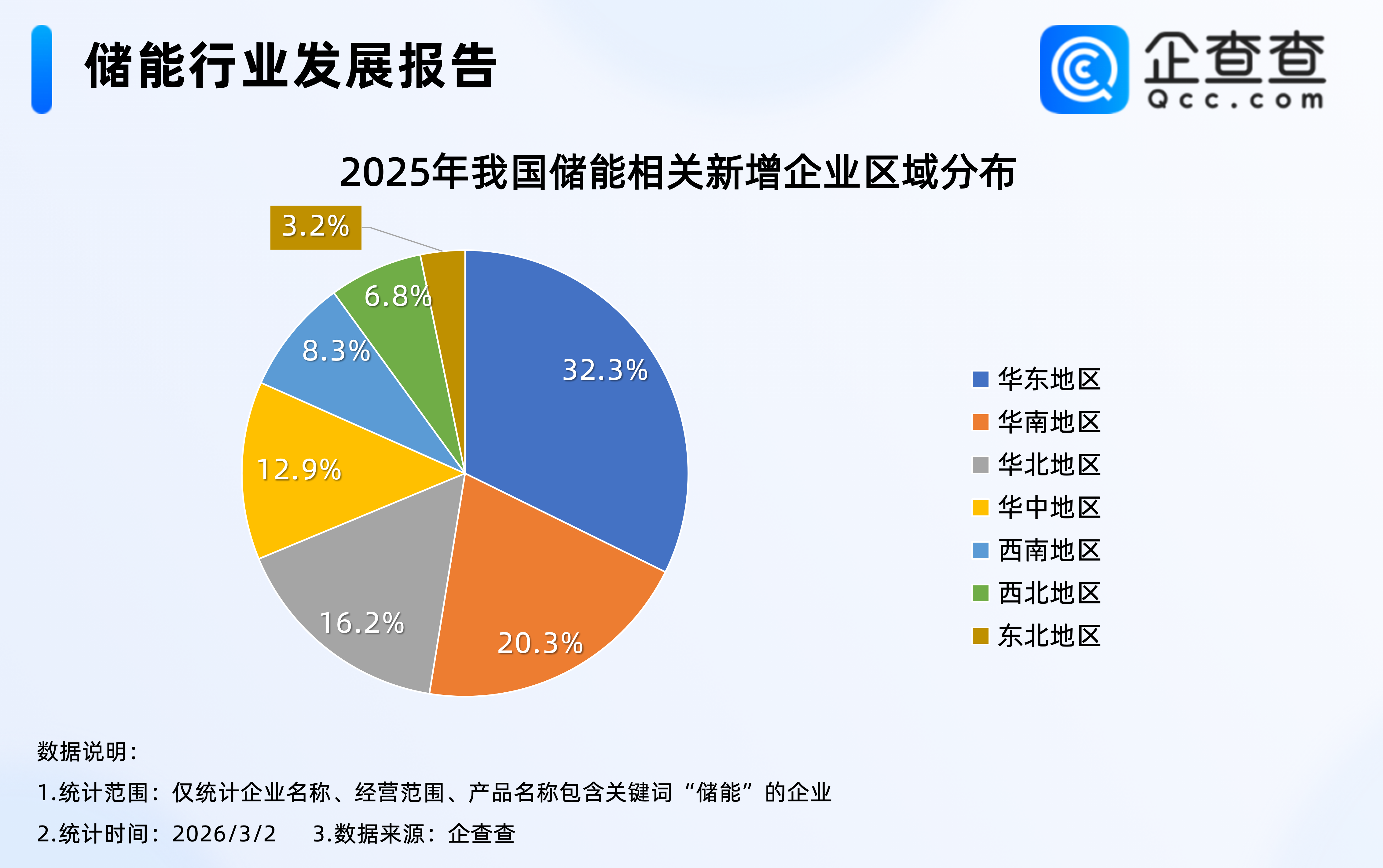 企查查数据显示,2025年新注册的10.7万家储能相关企业中,超三成位于华东地区,占比32.3%,其次是华南地区,占比20.3%,东北地区相对最少,占比3.2%。