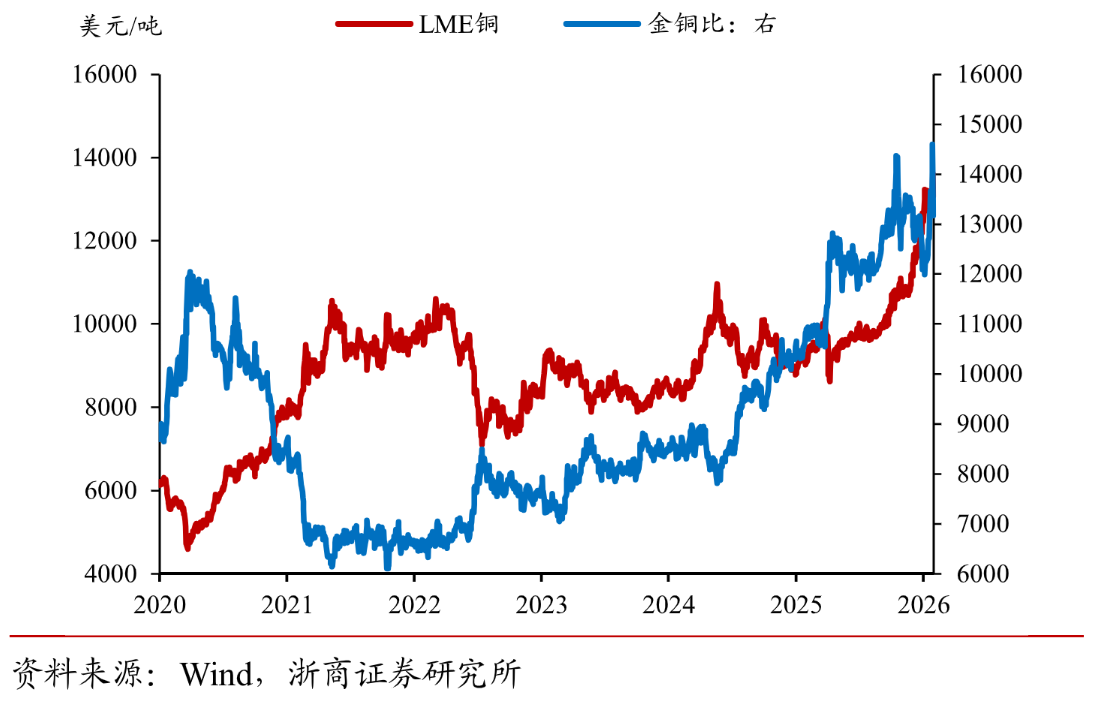 一方面,当前金铜比处于历史较高水平,从比价角度看铜相比黄金具备配置的性价比,后续部分资金可能转向估值相对合理的铜。