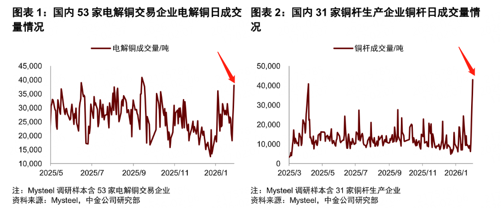 2月2日,国内铜价出现短暂回调,下游企业却纷纷大力“扫货”。数据显示,当天电解铜成交量达3.8万吨,环比增长108%;铜杆成交量4.3万吨,环比猛增198%,创下近一年来的新高。