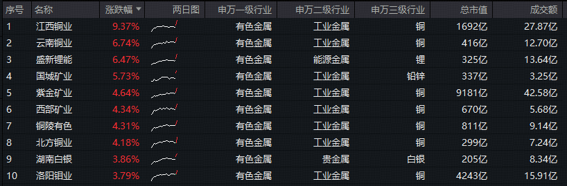 成份股方面,江西铜业领涨超9%,云南铜业、盛新锂能涨逾6%,国城矿业涨超5%,紫金矿业、西部矿业、铜陵有色、北方铜业等个股跟涨。