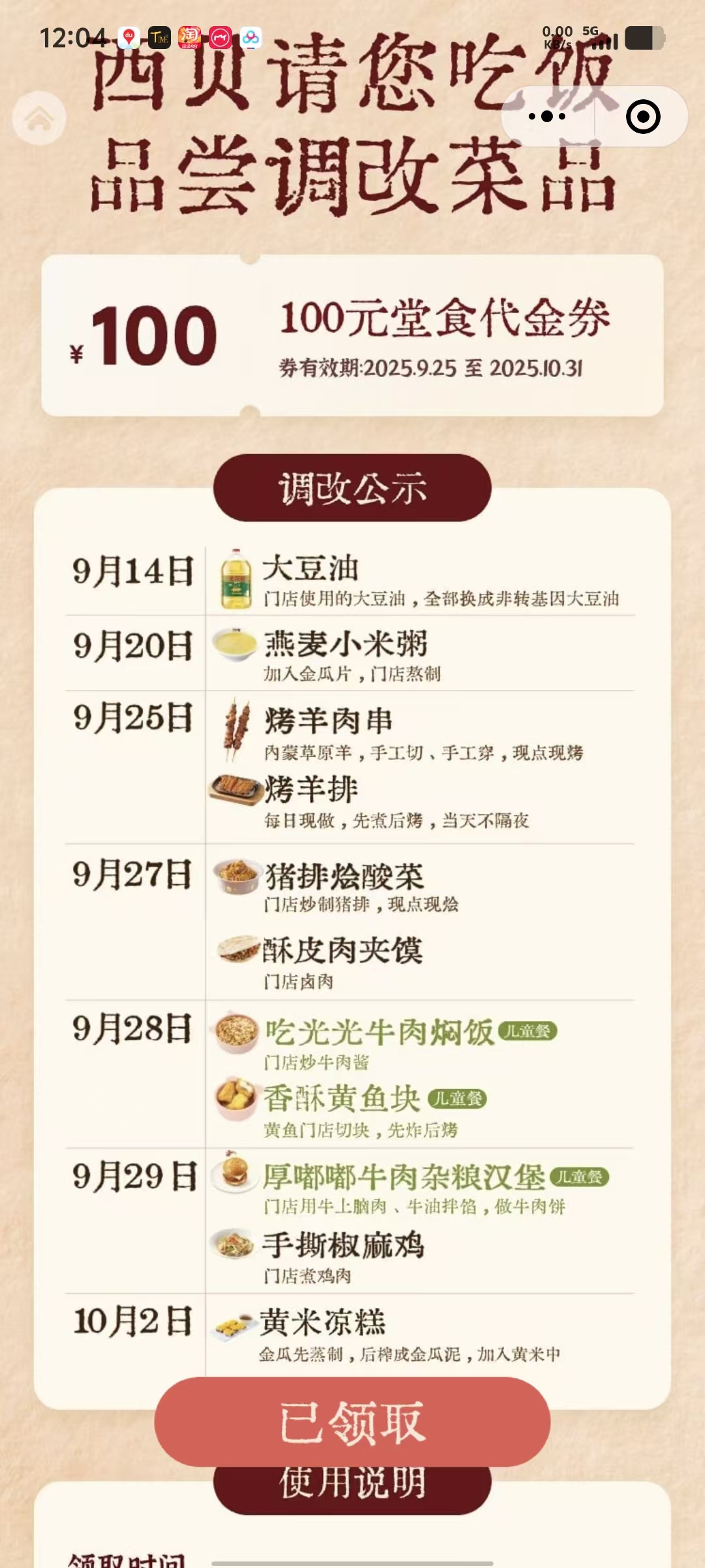 顾客领取代金券后,小程序也会显示出最新的调改公示,截至10月1日,西贝承诺的大多生产工艺调整已陆续完成。