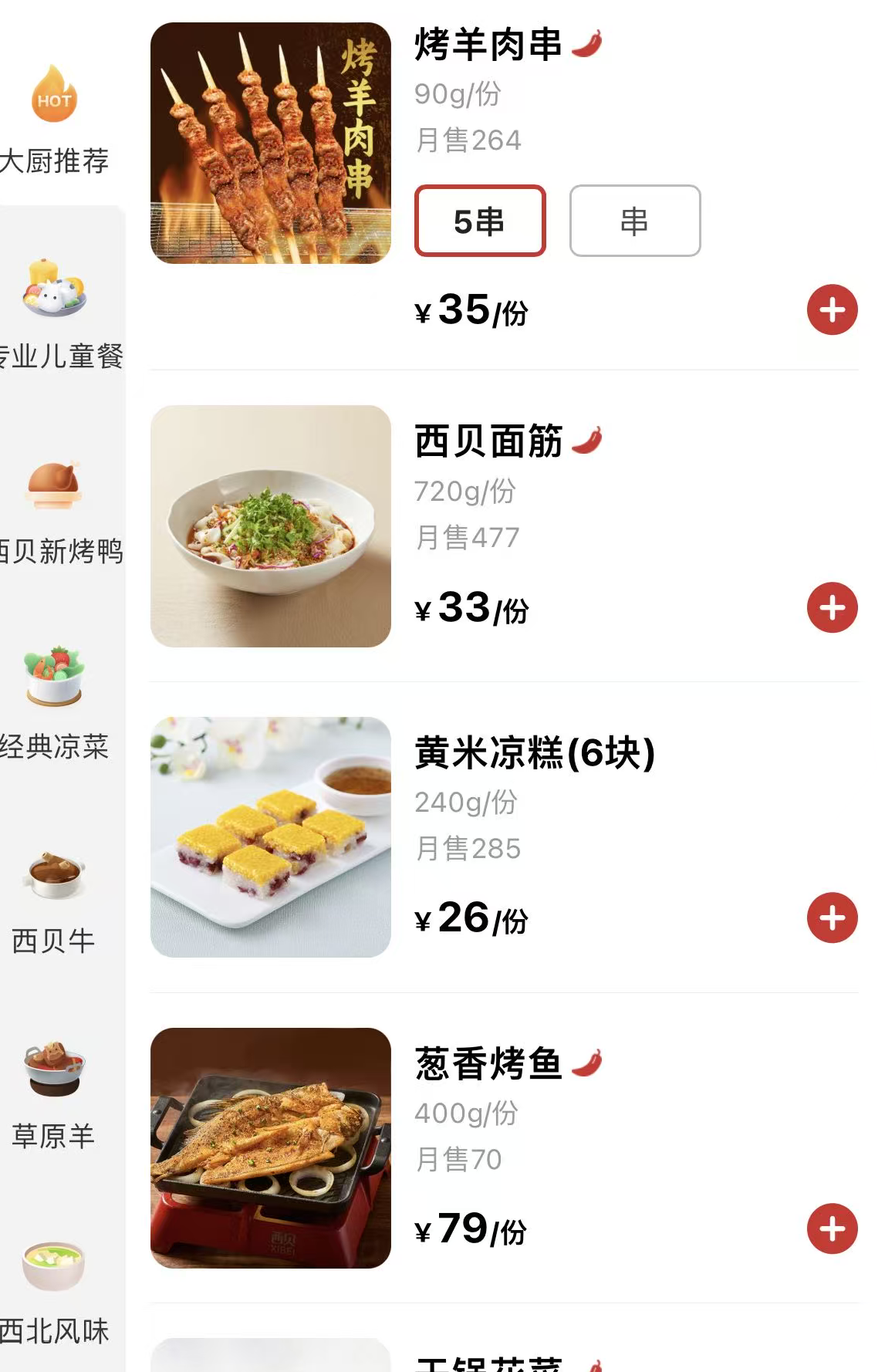 根据西贝小程序显示,原价29元的黄米凉糕(6块),现价显示为26元;原价39元的西贝面筋,现价为33元;原价89元的葱香烤鱼,现价79元;原价43元的胡麻油炒鸡蛋,现价为33元,降幅超20%。