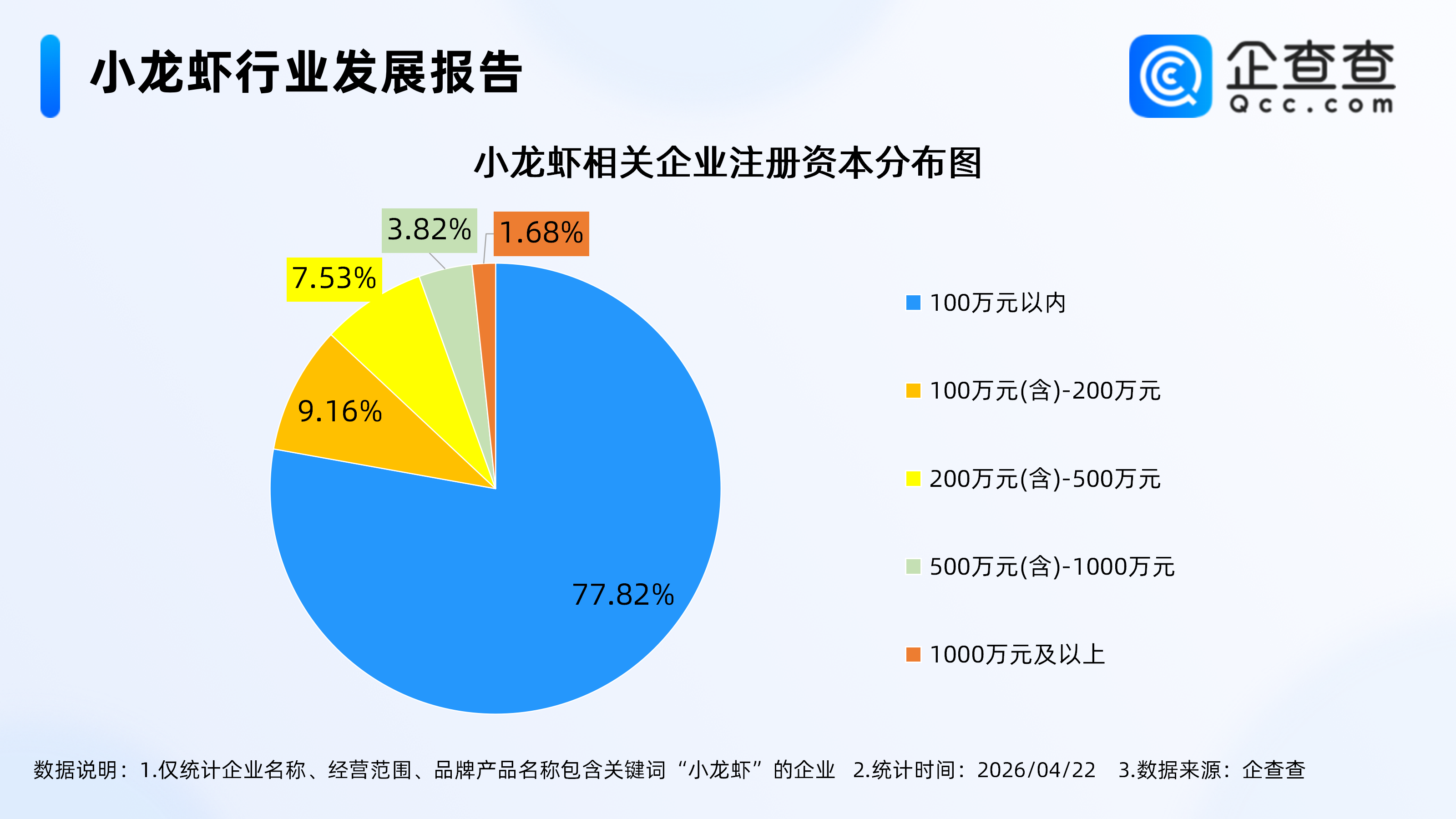 企查查数据显示,从注册资本分布来看,小龙虾相关企业多为轻量级企业,注册资本在100万元以内的企业最多,占比77.82%。其次,注册资本在100万(含)-200万、200万(含)-500万的企业分别占比9.16%、7.53%;注册资本500万(含)-1000万、1000万元及以上的企业占比仅为3.82%、1.68%。