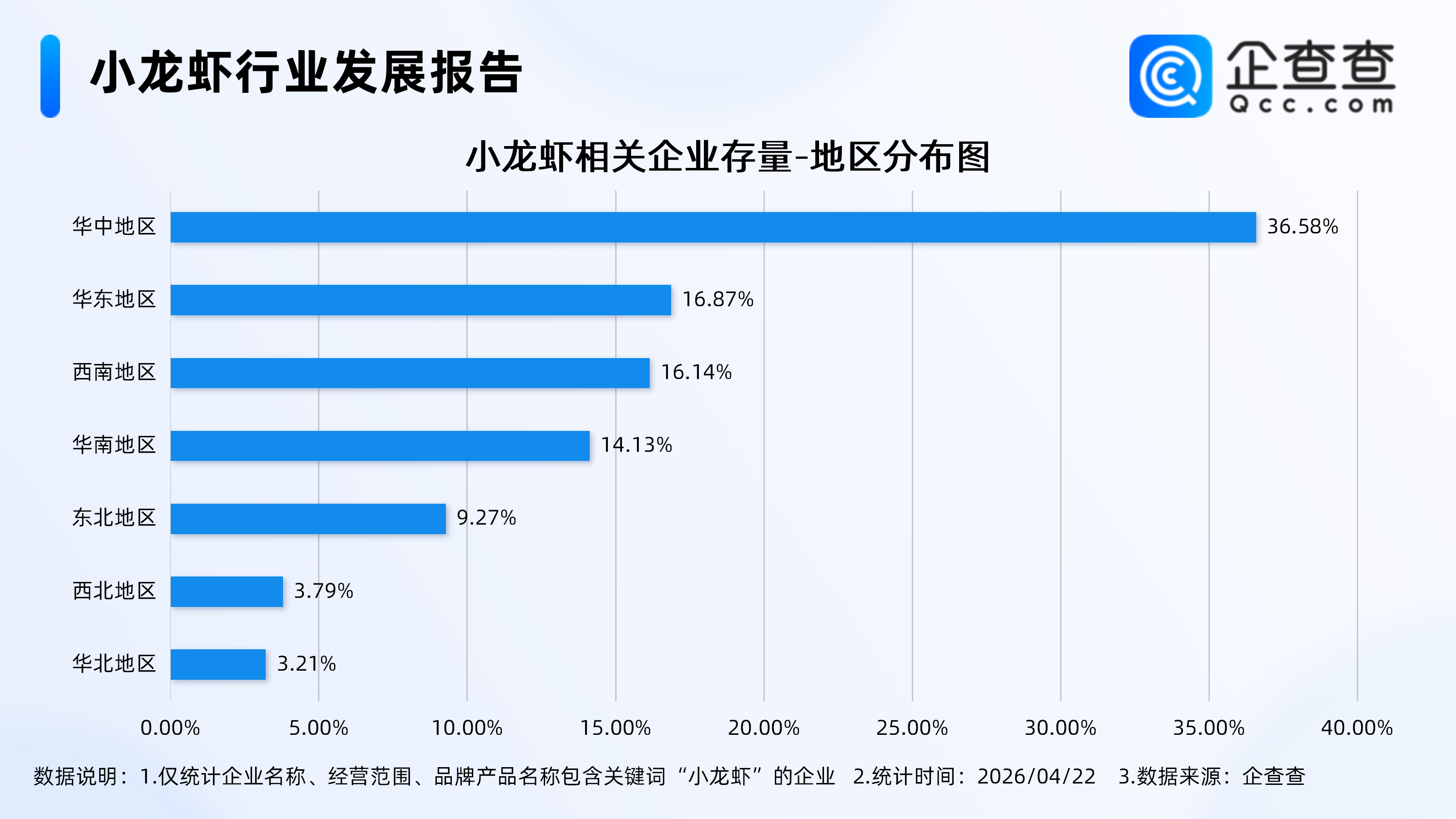 企查查数据显示,从地区分布来看,小龙虾相关企业有较为明显的地域集中性,多分布在华中地区,占比达36.58%,远超其他地区。其次,华东、西南、华南地区占比分别为16.87%、16.14%、14.13%。