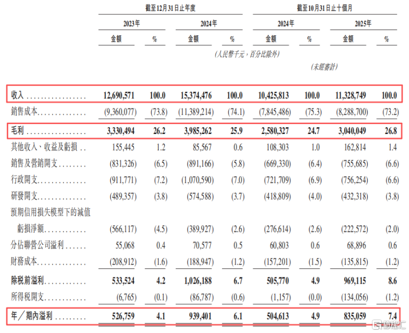 2023年、2024年及2025年1-10月(报告期),公司的收入分别为126.91亿元、153.75亿元、113.29亿元,净利润分别为5.27亿元、9.39亿元、8.35亿元,毛利率分别为26.2%、25.9%、26.8%。