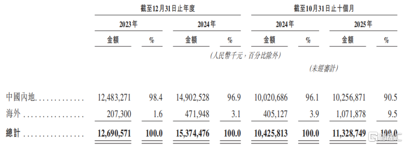 2023年,公司海外市场的收入为2.07亿元,占比为1.6%,至2025年1-10月,公司海外市场的收入增长至10.72亿元,占比增至9.5%。