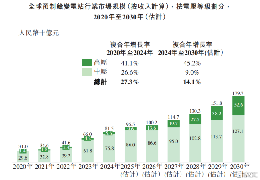 根据灼识咨询统计,2020年全球预制舱变电站市场规模为310亿元,至2024年增长至815亿元,复合年增长率达27.3%。预计到2030年全球预制舱变电站市场规模将达到1797亿元。