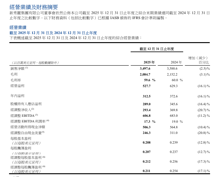 新秀丽于周五披露2025年全年业绩,净利润(归属于母公司)2.89亿元美元、按年减少16.4%,全年销售收入34.98亿美元、按年减少2.5%。