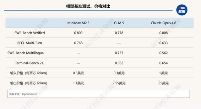之所以如此,与成本息息相关:MiniMax M2.5的输入端价格为0.3美元/每百万Token,输出端价格为1.1美元/每百万Token,而Claude Opus4.6输入端价格为5美元/每百万Token,输出端价格为25美元/每百万Token,中外模型的成本可谓天壤之别。