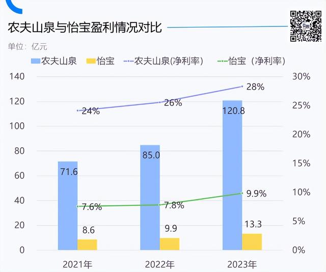 2023年,农夫山泉净利率是28.3%,怡宝只有9.9%,净利率差距接近30倍。