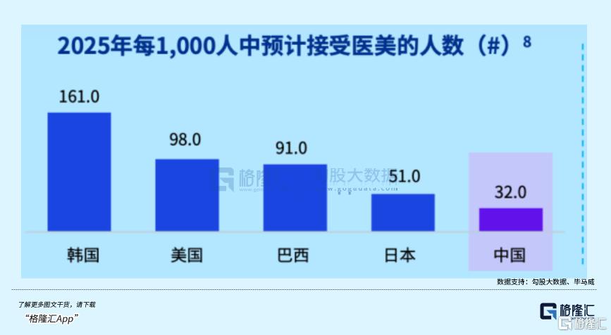 第二个β,来自与邻国的渗透率对比。根据毕马威数据,2025年韩国每千人接受医美的人数预计达161人,中国仅为32人。这一比率差距,意味着中国市场在渗透率维度上,还处于起点段。