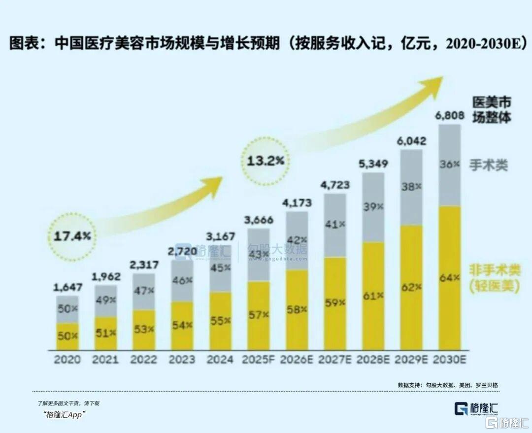 根据美团及罗兰贝格的数据,中国医疗美容市场规模预计将从2024年的约3100亿元,增长至2027年的4700亿元以上。增量近1600亿元,复合增速接近15%。与此同时,轻医美项目(如玻尿酸、热玛吉、水光针等非手术类项目)占比正从2020年的约50%,向2030年的64%以上持续迁移。