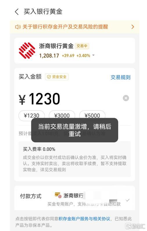 有投资者表示,“现在金价低,想加仓来拉低均价,结果浙商银行积存金一直买不进去。系统显示,当前交易流量激增,请稍后重试。”工商银行积存金页面也一度显示“当前交易流量激增,请稍后重试”。