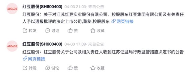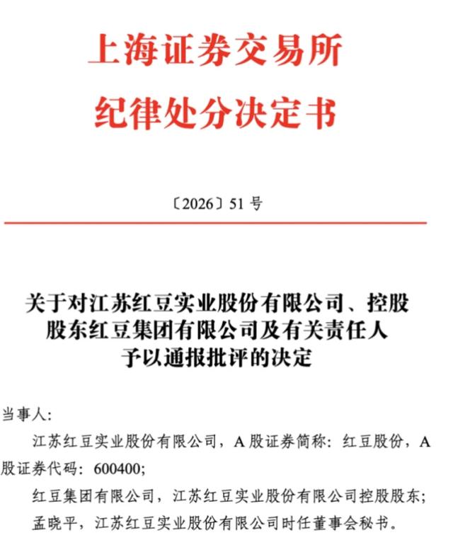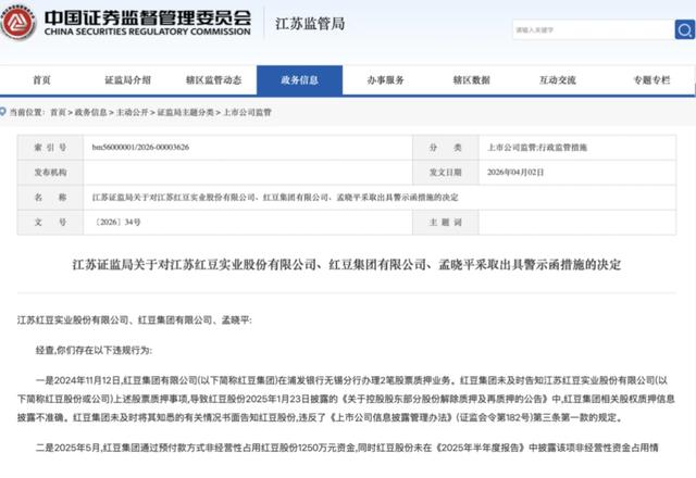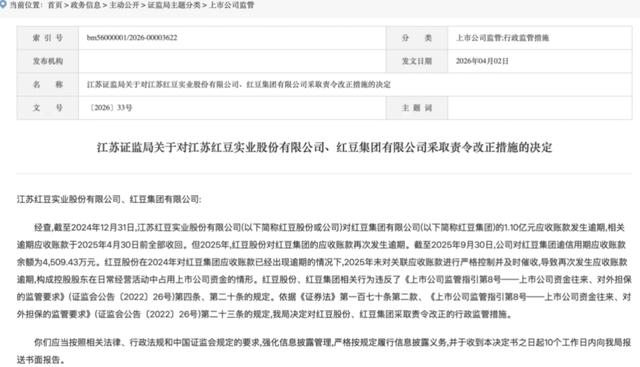 2026年4月3日,江苏红豆实业股份有限公司(600400.SH)同时收到了江苏证监局的行政监管措施决定书和上海证券交易所的纪律处分决定书,成为A股市场少有的、一日内被两类监管机构同步追责的案例。