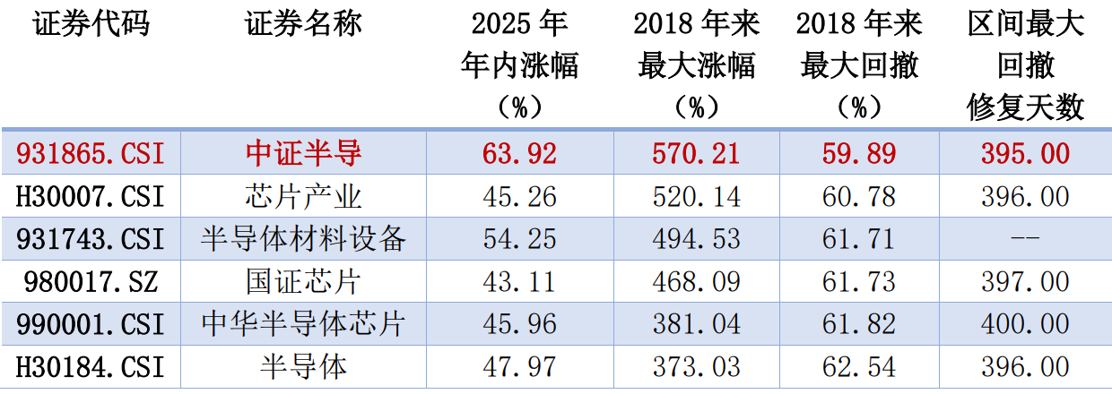 咱们复盘一下上一轮半导体周期,可以发现从2018年至今,中证半导的区间最大涨幅是几个主流半导体指数中最高的,最大回撤最低,而且2025年的年内涨幅也是最高,绝对的弹性冠军。