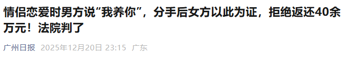 情侣恋爱时,男生说过“我养你”,分手后女生以此为由,拒绝归还40多万元。法院最终酌情判决,女方需返还男方款项及金饰折价款等合计30万元。