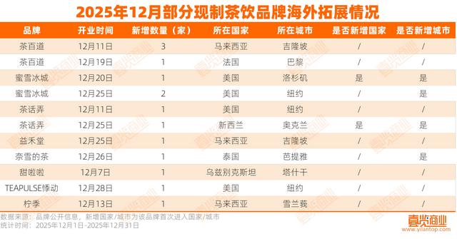 据茶咖观察不完全统计,2025年12月,共有8个茶饮品牌在海外开设了14家新店。