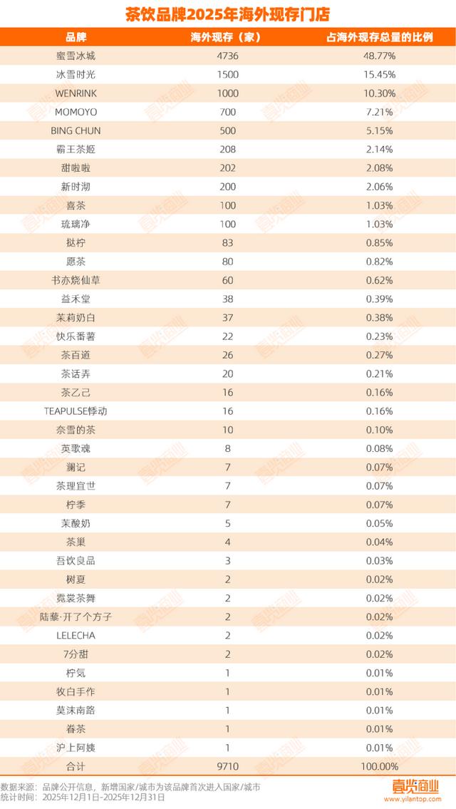 从门店存量看看,截至2025年12月30日,据茶咖观察统计,至少有38个品牌在海外开设了9710家门店。