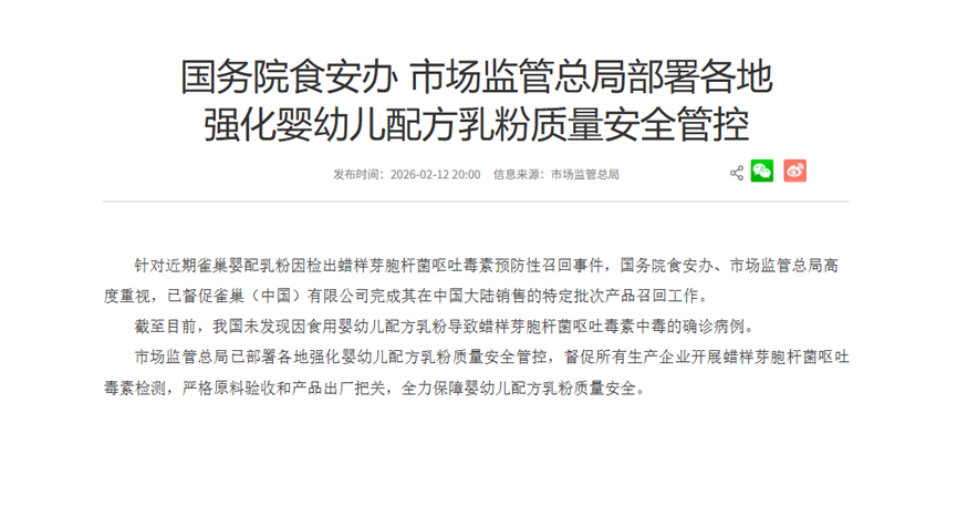 2 月 12 日晚,国务院食安办、市场监管总局通报,已督促雀巢(中国)完成中国大陆特定批次产品召回工作。截至目前,我国未发现因食用婴幼儿配方乳粉导致蜡样芽胞杆菌呕吐毒素中毒的确诊病例。