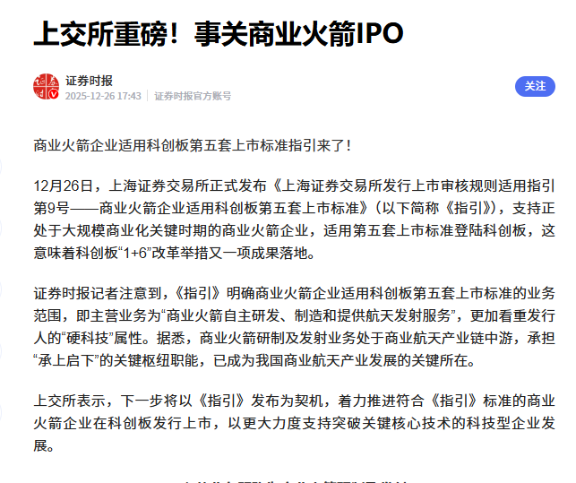 二是金融上,成立国家商业航天发展基金,引导地方和社会资本进入到商业火箭领域,更重要的是为商业火箭企业的上市打通了上市的通道,2025年12月,上交所发布《上海证券交易所发行上市审核规则适用指引第9号——商业火箭企业适用科创板第五套上市标准》,支持为尚未盈利但掌握核心技术的商业火箭企业上市IPO。