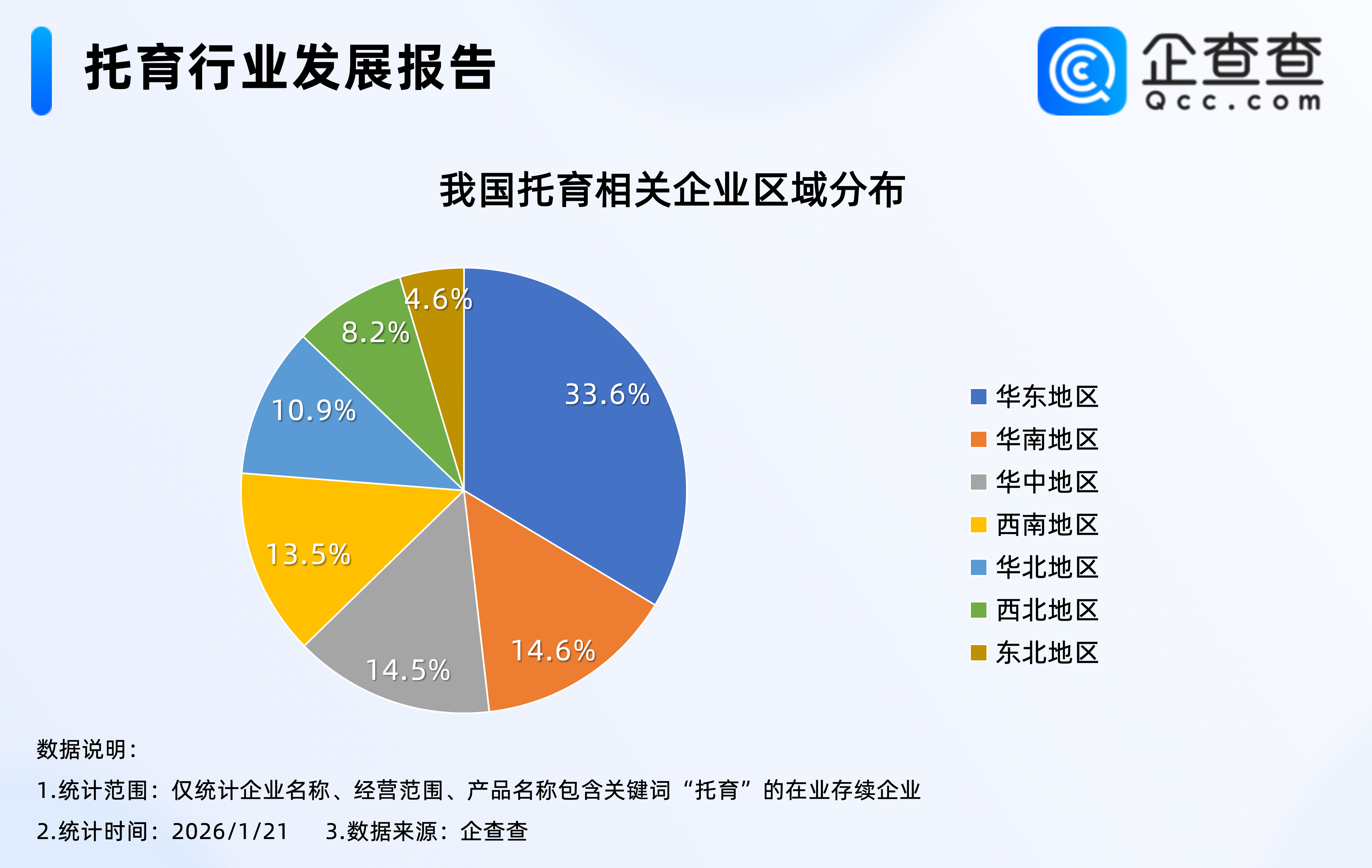 企查查数据显示,我国现存的14.2万家托育相关企业中,分布在华东地区的相关企业最多,占比33.6%,其次是华南、华中地区,分别占比14.6%、14.5%;东北地区相对最少,占比4.6%。