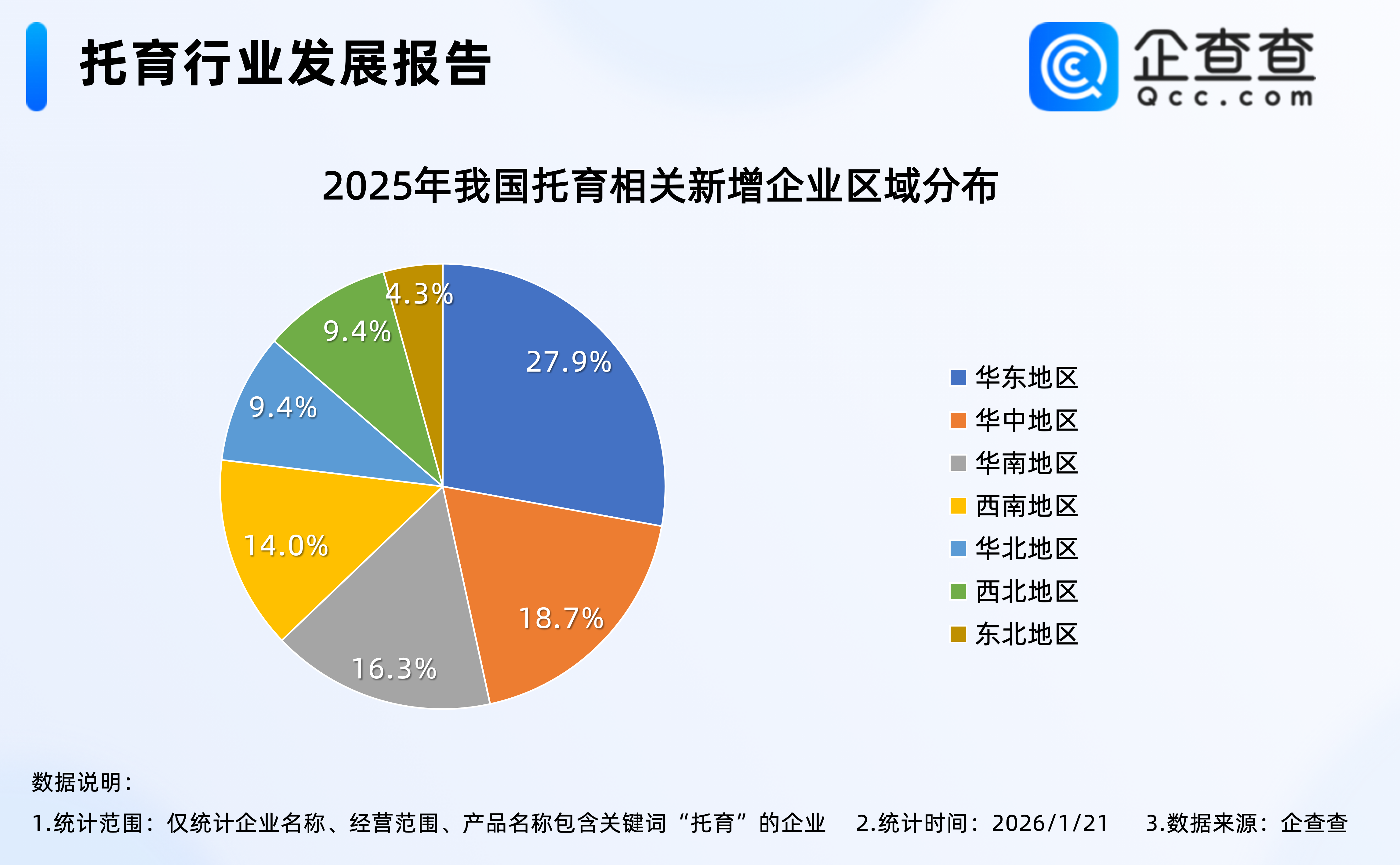 企查查数据显示,2025年全年,我国累计注册1.98万家托育相关企业,区域分布上,依然是华东地区最多,占比27.9%,与全国存量区域分布不同的是,华中地区2025年累计注册3703家托育相关企业,占全国注册总量的18.7%,超过华南地区,华南地区占比16.3%。