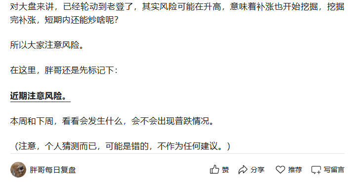 昨天文章原话:“对大盘来讲,已经轮动到老登了,其实风险可能在升高,意味着补涨也开始挖掘,挖掘完补涨,短期内还能炒啥呢?所以大家注意风险。”