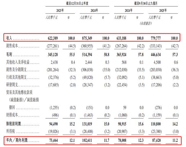 利润端虽净利润同步增长,分别为7546.4万元、1.03亿元、8742万元,但盈利效率却持续承压。各期毛利率分别为55.5%、58.8%、57.3%,净利润率分别为12.1%、11.7%、11.2%。呈现出“高毛利率、低净利率”的特征。