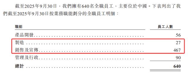 截至2025年9月30日,公司640名全职员工中,制造环节员工仅27人,生产完全依赖62家OEM制造商,自有工厂于2025年10月才实现小规模投产,品控把控能力极弱。