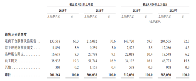在享受线上直销高毛利的同时,公司也持续面临销售费用高企的压力。为直接触达消费者,高昂的营销与流量购买成为刚性支出。招股书显示,其销售及分销开支从期初的2.01亿元增至期末的2.83亿元(期间最高达3.06亿元),而净利润率却从12.1%下滑至11.2%。值得注意的是,电商平台服务及推广费的占比从期初的66.3%攀升至期末的72.3%,成为最主要的费用驱动因素。