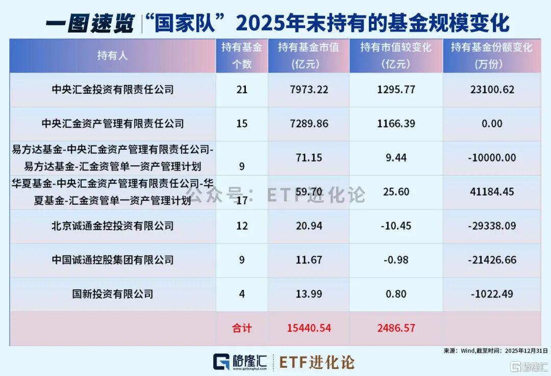 这或许意味着理财、年金、险资等机构资金当下仍存在权益配置需求,恰逢基金2025年年报披露前十大持有人名单,各类机构的持仓动态也浮出水面,其中最引人瞩目的当属“国家队”了。