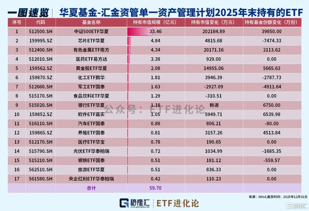 华夏基金-汇金资管单一资产管理计划去年四季度加仓:中证500ETF华夏、有色金属ETF南方、黄金股ETF华夏;新进银行ETF华夏;减持芯片ETF华夏、化工ETF鹏华和军工ETF国泰。