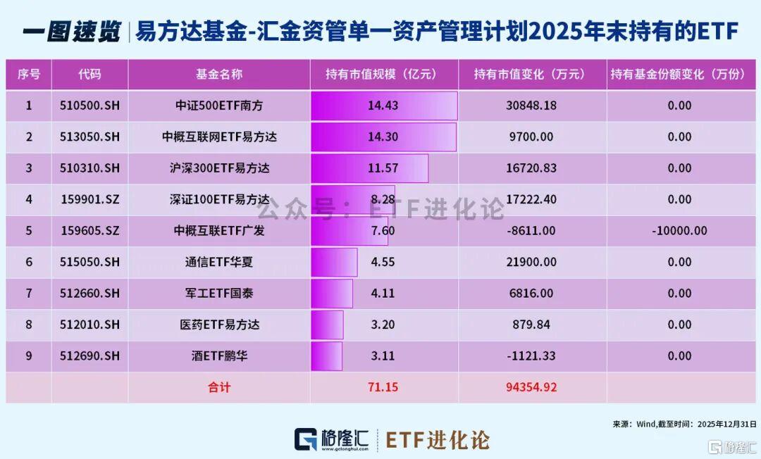 截至2025年年末,中央汇金投资、中央汇金资产的ETF持仓在去年下半年没有变化。