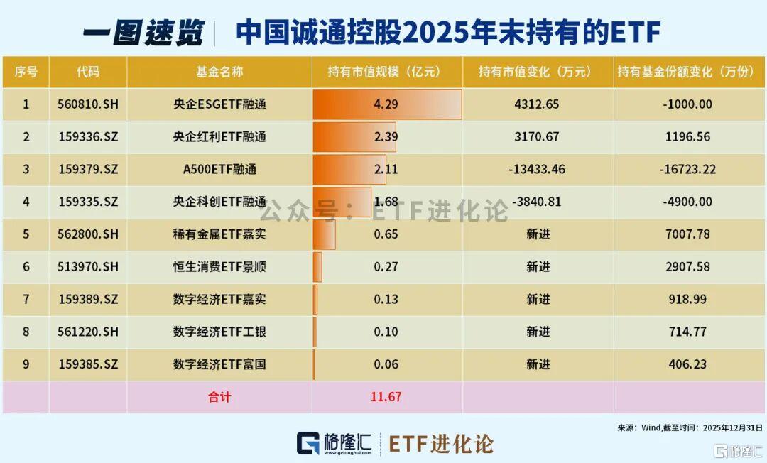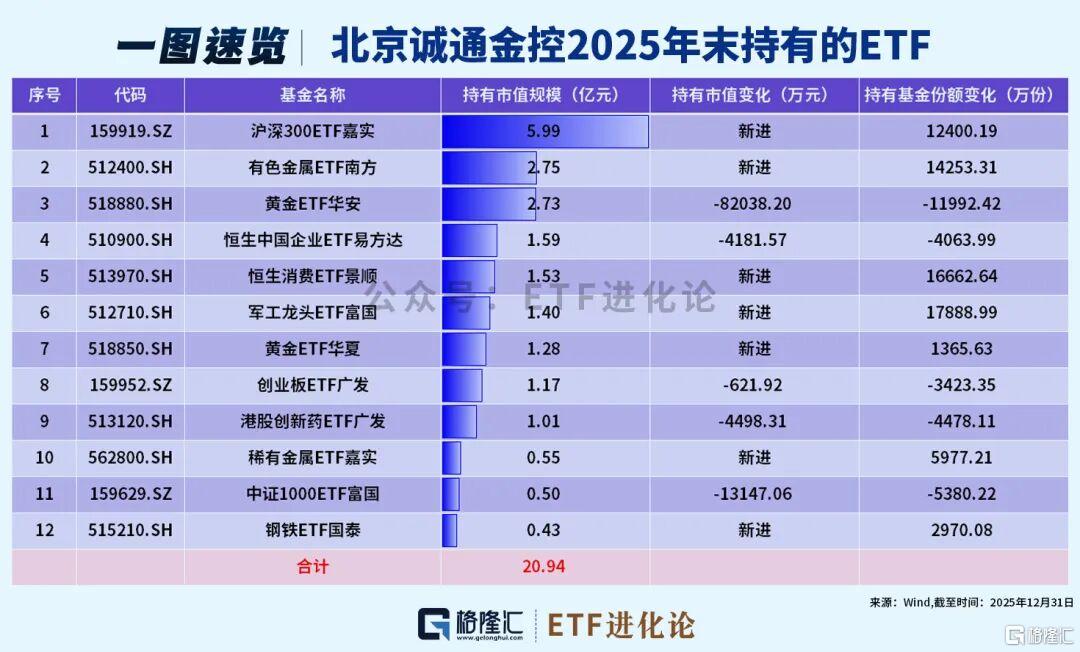 北京诚通2025年下半年新进:沪深300ETF嘉实、有色金属ETF南方、恒生消费ETF景顺、军工龙头ETF富国、黄金ETF华夏、稀有金属ETF嘉实和钢铁ETF国泰,减持黄金ETF华安、恒生中国企业ETF易方达。