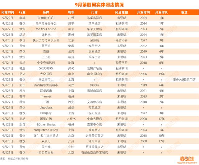 据壹览商业不完全统计,九月第四周,共25个品牌关闭了至少27家门店。
