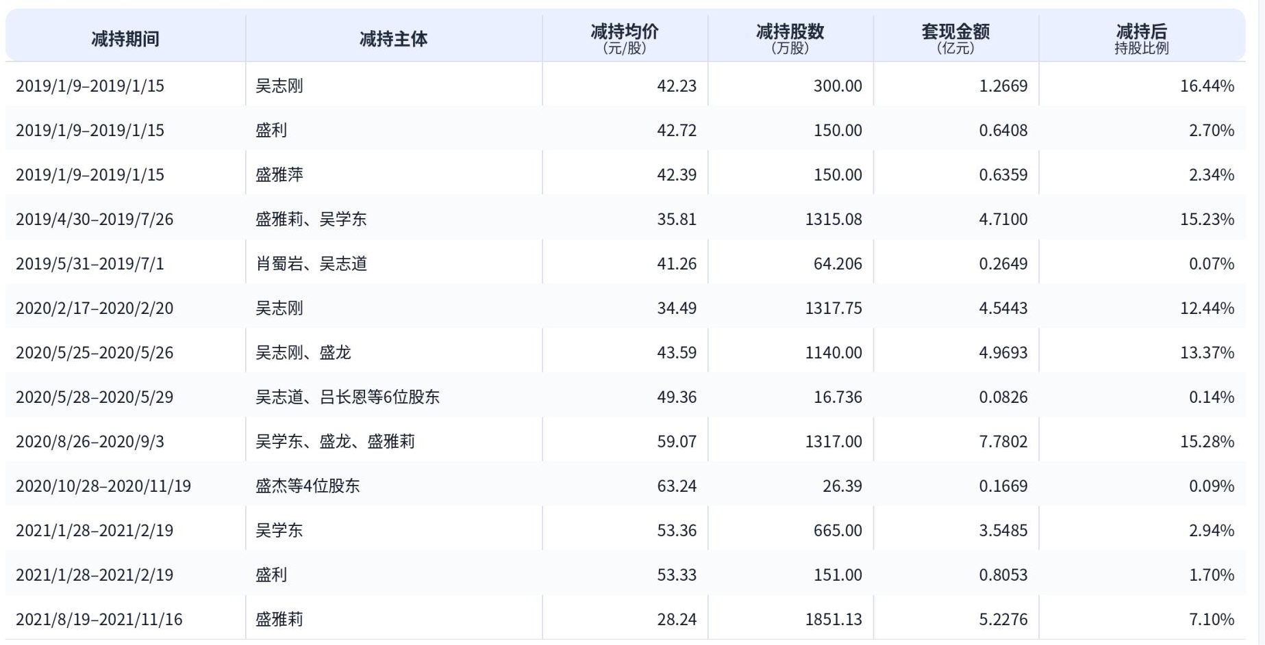 其中,吴志刚、吴学东、盛雅莉等为主要减持主体,减持方式以大宗交易和集中竞价为主,减持时间主要集中于2019年至2021年。