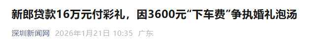 新郎贷款16万元付彩礼,因3600元“下车费”争执婚礼泡汤。