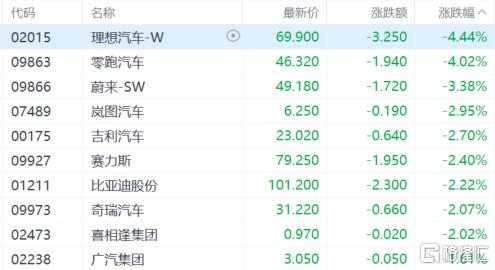 汽车股大跌,理想汽车、零跑汽车跌超4%,蔚来汽车跌超3%,岚图汽车、吉利汽车、塞力斯等跟跌。