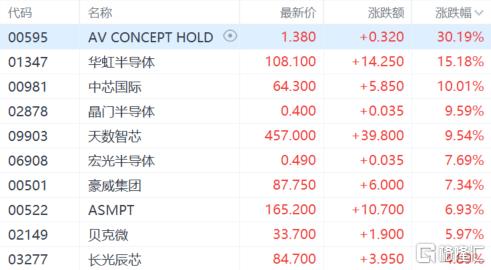 半导体、芯片股大涨,华虹半导体涨超15%,中芯国际涨超10%,晶门半导体、天数智芯涨超9%,宏光半导体、豪威集团涨超7%。