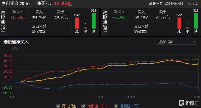 今日,南向资金净买入34.6亿港元,其中港股通(沪)净买入41.69亿港元,港股通(深)净卖出7.09亿港元。