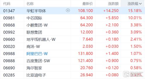 大型科技股多数上涨,华虹半导体涨超15%,中芯国际涨超10%,小鹏汽车、联想集团涨超3%。