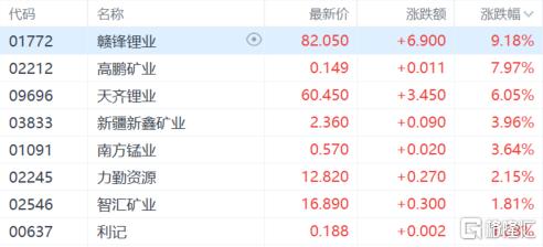 金属及矿物股走高,赣锋锂业涨超9%,天齐锂业涨超6%,力勤资源、智汇矿业等跟涨。