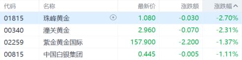 黄金股持续跌势,珠峰黄金、潼关黄金跌超2%,紫金黄金国际、中国白银集团跌超1%。
